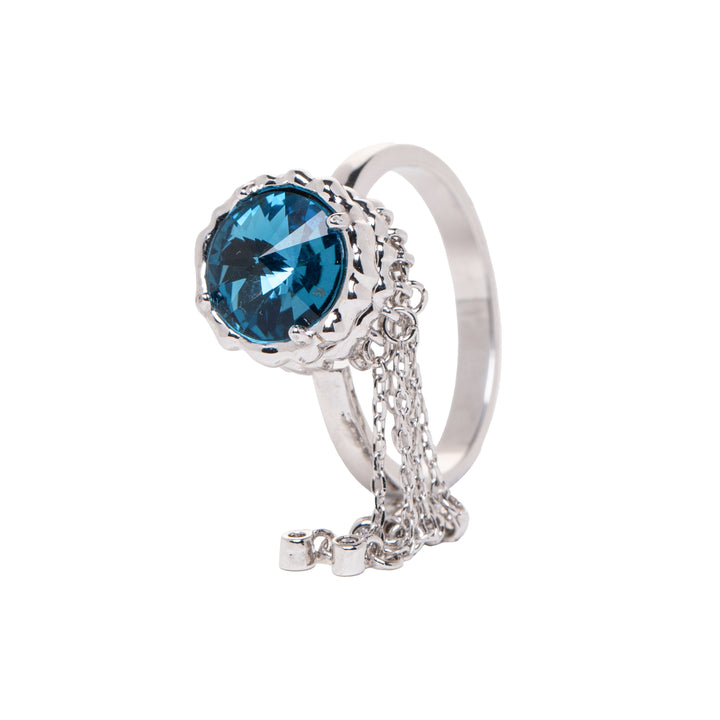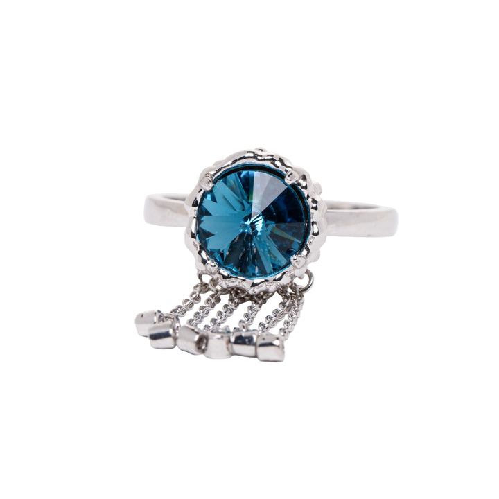 The ring is designed with an adjustable band, making it suitable for most finger sizes. At its center, a beautiful blue stone is set atop a rotating top, adding a unique and playful element to the design. Delicate tiny chains hang from the stone, creating a subtle yet captivating movement. This ring combines style and functionality, making it a perfect accessory to elevate any outfit with its sophisticated charm and versatile appeal. This finger ring is crafted from high-quality stainless steel, with premium silver finish and an anti-tarnish coating to ensure long-lasting shine. Weighing imately 2.5 grams, it is lightweight and comfortable for everyday wear.