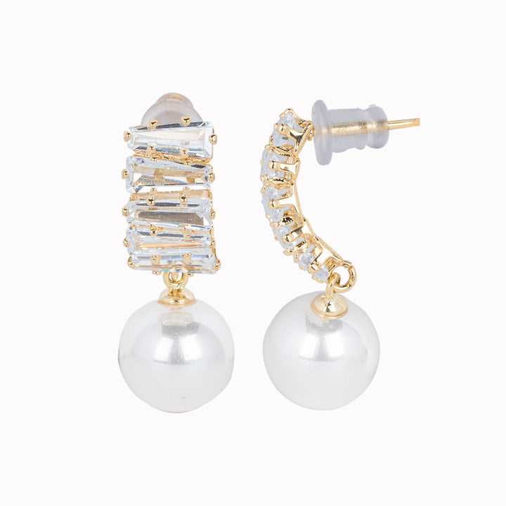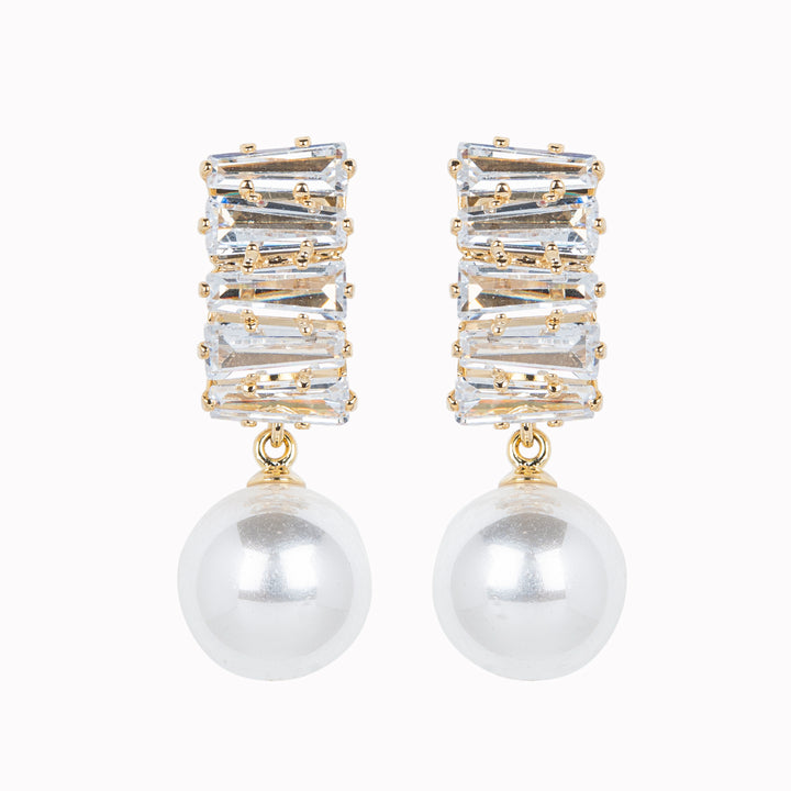 The earring set includes one pair made from stainless steel, with an imate weight of 8 grams. Designed in one size, this elegant pair features a pearl drop and baguets. A stylish and sophisticated choice for various occasions.