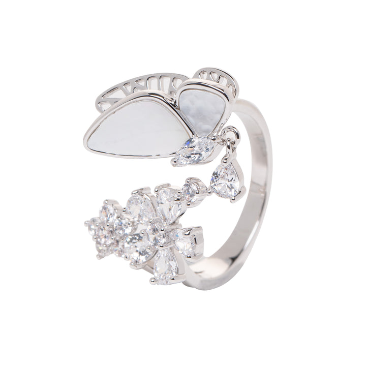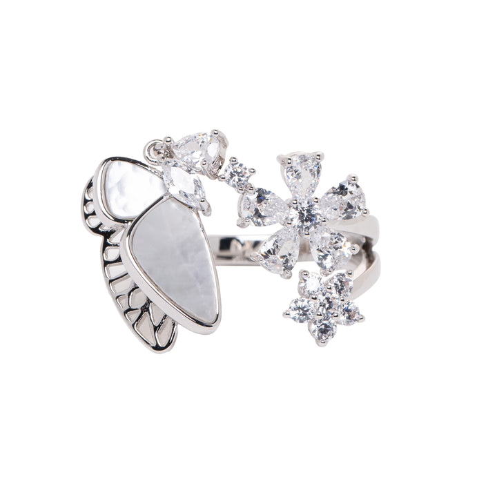 The ring features a unique design with a half butterfly on one end, its wings made from onyx-like material, and small rhinestone flowers on the other end. This elegant ring combines nature-inspired elements with a touch of sparkle, making it a perfect accessory for both casual and formal occasions, adding a refined, whimsical charm to any look. This delicate adjustable ring is crafted from stainless steel with silver finish and an anti-tarnish coating, ensuring long-lasting beauty. The ring weighs imately 2.5 grams