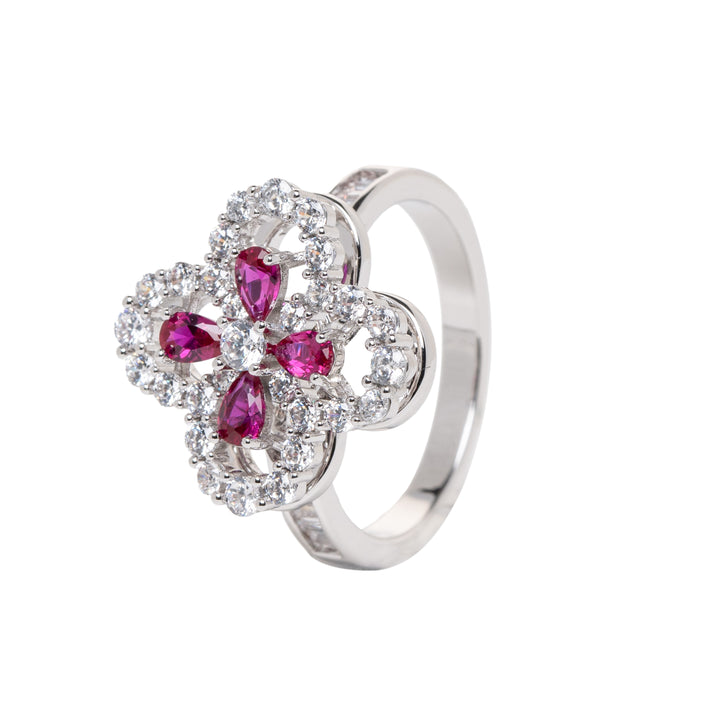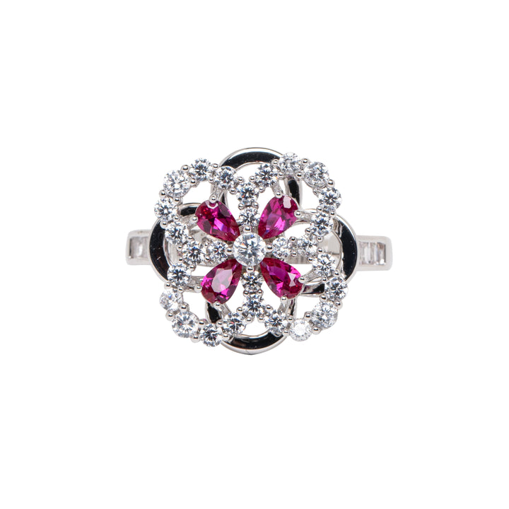 Weighing imately 4 grams, the ring features a unique rotatable top with a striking red ruby and white stone flower and petals. The band is embellished with baguette stones, adding a touch of sophistication and sparkle. With its elegant design and rotating feature, this ring is a perfect statement piece for any occasion. This stunning adjustable ring is crafted from stainless steel with a sleek silver finish and an anti-tarnish coating for lasting shine.