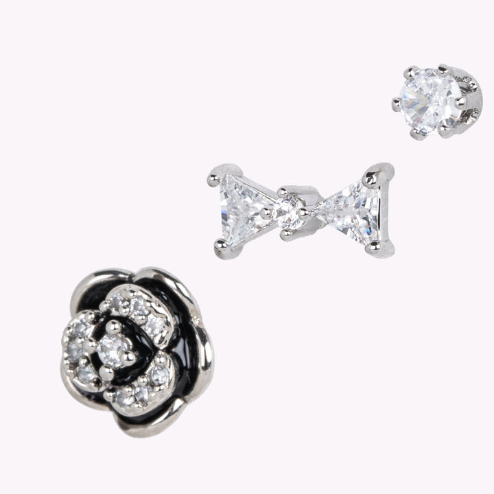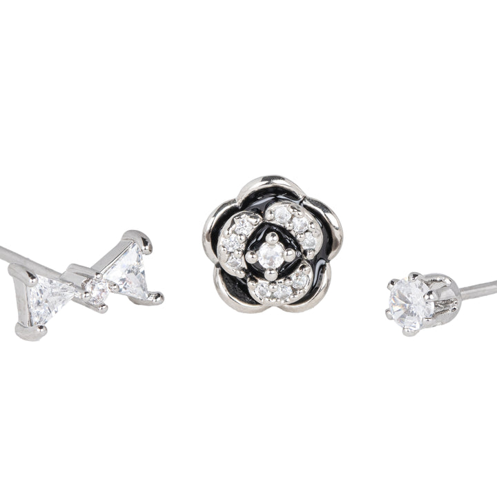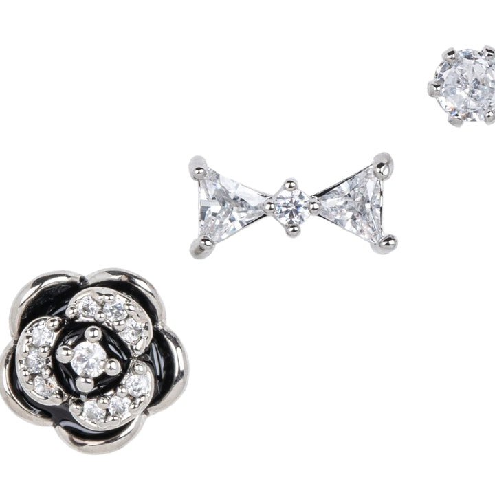 The earring set includes three pairs in one, crafted from stainless steel and weighing imately 15 grams. The set features a black flower-shaped pair, a bow-shaped pair, and a small round diamond piece, offering a mix of elegance and charm. Designed in one size, these versatile earrings complement various styles effortlessly.