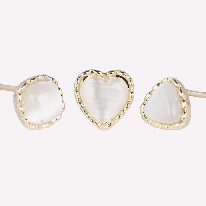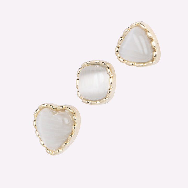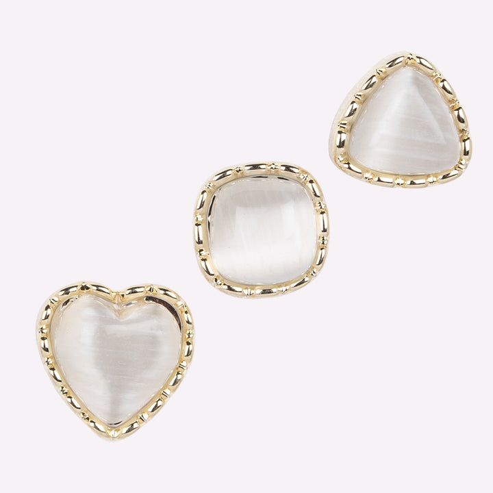 The 3-in-1 earring set (ER250176G) is made from stainless steel and weighs imately 15 grams. This stylish set features three uniquely shaped pairs: one heart-shaped, one triangle-shaped, and one square-shaped pair, each adorned with a opal looking stone in the middle. Designed in one-size-fits-all, this elegant collection is perfect for adding variety and charm to your jewelry collection.