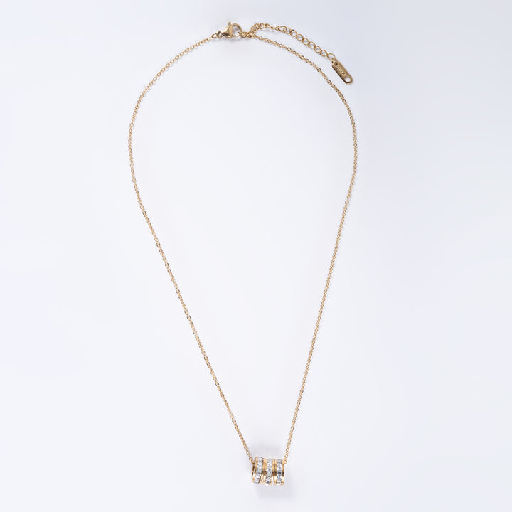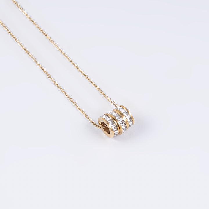 This elegant 18 carat gold tone finish neck chain with pendant features a three-tiered ring pendants made with rhinestones, creating a bold yet sophisticated statement piece. Its tiered design adds depth and dimension, making it a unique and eye-catching accessory. Weighing imately 28g, the necklace is one-size adjustable, ensuring a perfect and comfortable fit. The golden finish enhances its luxurious appeal, making it suitable for both formal and casual wear.