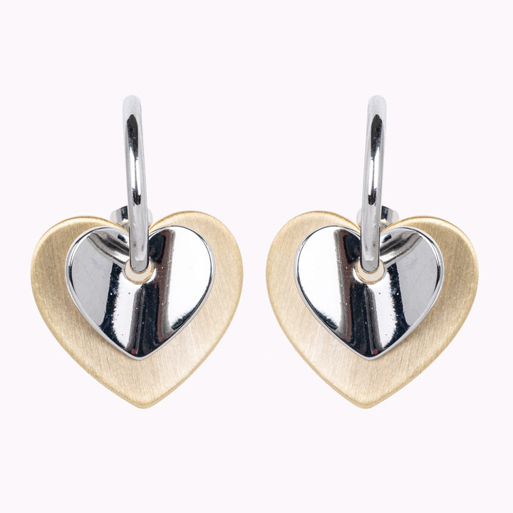 This golden pair of stainless steel earrings features a charming dual-heart design, with a larger golden heart base and a smaller silver heart accent for a unique two-tone effect. Weighing imately 6g, these earrings are lightweight, durable, and resistant to tarnishing, making them a stylish and lasting addition to your collection. With a one-size-fits-all fit, they offer a perfect blend of elegance and modern sophistication.